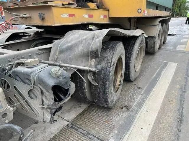 在惠州博罗县,一辆小车与对向行驶的重型货车发生碰撞,碰撞后小车车尾撞上树干,车头已完全变形,机油渗漏至地面,双闪灯还在不停闪烁。由于驾驶人及乘客都系了安全带,车上人员并无大碍。