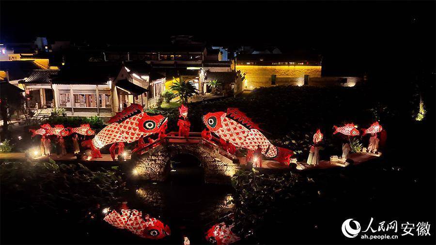 锣鼓响,鱼灯亮,烟花起。整座古村宛如一尾苏醒的巨鲤,在山水间摆尾生辉,吸引了众多游客前来观灯,感受古徽州的民俗文化和非遗魅力。