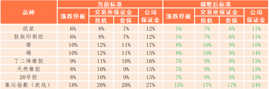 依据上期发〔2025〕287号《关于调整纸浆和胶版印刷纸期货交易保证金比例和涨跌停板幅度的通知》、上期发〔2025〕288号《关于调整镍等期货交易保证金比例和涨跌停板幅度的通知》和上能发〔2025〕39号《关于调整20号胶等期货交易保证金比例和涨跌停板幅度的通知》及目前国内外市场形势。我司决定自2025年10月14日结算时起,按照下表调整相应期货品种各合约的公司保证金标准: